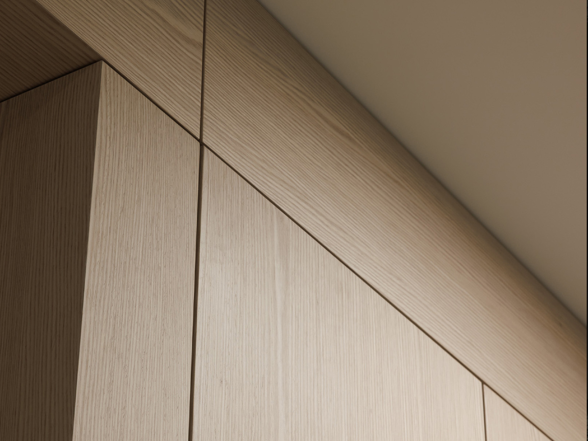 Ещё один ключевой момент в этой кухне — общий минимализм, доведённый до уровня архитектуры пространства. Мы добились этого за счёт единой отделки: все фасады выполнены в шпоне, без декора, без видимых ручек, с полностью скрытыми системами открывания. В результате кухня воспринимается как цельный, монументальный объём, а не набор отдельных элементов. Но на этом решение не заканчивается. Та же отделка продолжается на стены и поднимается до потолка, формируя единую плоскость. В ней предусмотрены аккуратные вырезы под систему вентиляции, которая проходит через всю квартиру. За счёт этого инженерные элементы не нарушают чистоту интерьера, а становятся его частью. Эта линия продолжается дальше — в зону гостиной и в дверной портал, о которых мы расскажем отдельно. Фото: Иван Сорокин