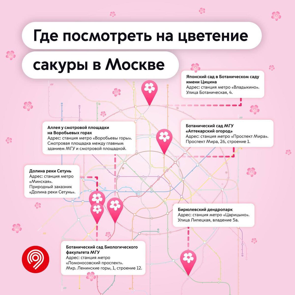 Делимся с вами подборкой мест, где можно увидеть эту красоту. В карточке — ближайшие станции метро и точные адреса 👆 🔹 Аллея у смотровой площадки на Воробьевых горах. Одно из лучших мест для эффектных фото. Вход бесплатный. 🔹 Бирюлевский дендропарк. Здесь вы найдете павильон в азиатском стиле. Вход бесплатный. 🔹 Долина реки Сетунь. Здесь можно прокатиться на велосипеде в окружении прекрасных деревьев. Вход бесплатный. 🔹 Ботанический сад МГУ «Аптекарский огород». Здесь растет та самая сакура со склонов горы Фудзияма. Обратите внимание: вход платный. 🔹 Японский сад в Главном Ботаническом саду имени Н. В. Цицина. Помимо сакуры вы увидите настоящую пагоду. Вход платный. 🔹 Ботанический сад Биологического факультета МГУ. Здесь растет один из самых маленьких видов сакур — курильская вишня. Вход платный.