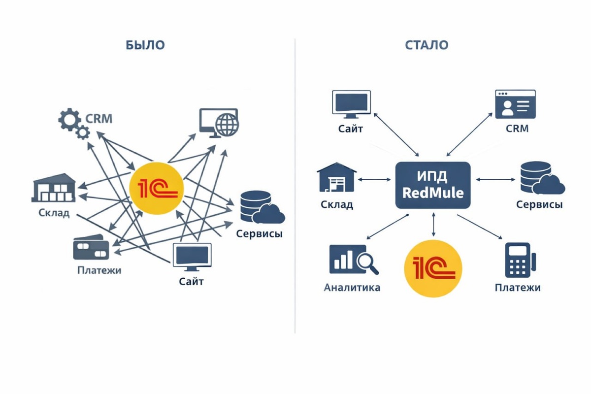 На старте всё работает нормально: интеграция 1С с сайтом, CRM и другими системами кажется простой и логичной. Но проходит время, компания растет, а вместе с этим: В какой-то момент 1С превращается в центр всех интеграций, а не в учетную систему. И именно на этом этапе бизнес начинает терять скорость. Частая ошибка - это думать, что всё дело в росте: больше сервисов → больше проблем На практике причина в другом - неправильная архитектура интеграции 1С. Когда каждая система подключена напрямую, получается перегруженная схема: Сначала это удобно, а потом становится критично. Почему такая интеграция 1С ломается: И главное — масштабирование становится дорогим и медленным. Когда начинаются сбои, бизнес выбирает очевидный путь: На короткой дистанции это кажется выгодным, но на практике: каждая доработка увеличивает сложность