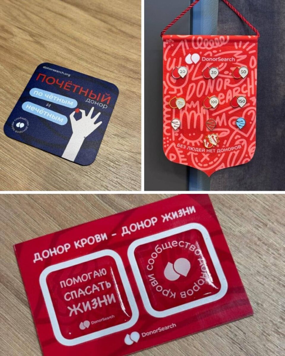 👉🏻Стикерпак для доноров крови Набор стикеров, который помогает рассказать о донорстве без лишних слов: наклейте на ноутбук, телефон или блокнот и покажите, что вы в донорском сообществе. 👉🏻Магнит «Почётный донор» Небольшой сувенир на холодильник или доску, который каждый день напоминает, что вы уже прошли большой путь. 👉🏻Вымпел DonorSearch Аккуратный вымпел для любимой коллекции донорских значков, чтобы хранить их красиво в одном месте — дома или на рабочем столе. Делитесь своими идеями: какой сувенир мог бы вдохновить людей стать донорами? 🩸