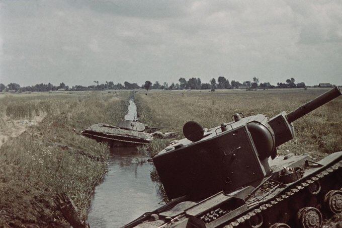 Представьте себе ситуацию: советские танки КВ-2 и Т-34 4-го мехкорпуса, как два неумехи, застряли в мелиоративной канаве