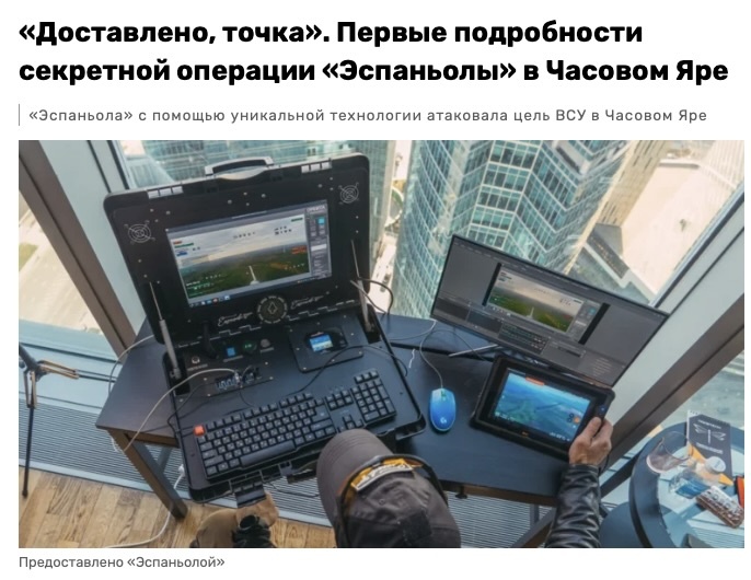 «На опубликованных «Эспаньолой» кадрах военнослужащий в Артёмовске устанавливает дрон на место взлета. После чего Испанец, находящийся за пультом управления, подключает его к «Орбите» и с помощью компьютерной мыши и монитора начинает взлет. Дистанция полета 14 километров. Оператора от дрона отделяет вся тысяча. Спустя несколько минут Испанец обнаруживает цель — огневая точка противника в Часовом Яре, за которой бойцы «Эспаньолы» некоторое время вели наблюдение — и бьет по ней «Оводом». Спустя считанные секунды — опорник ВСУ уничтожен».