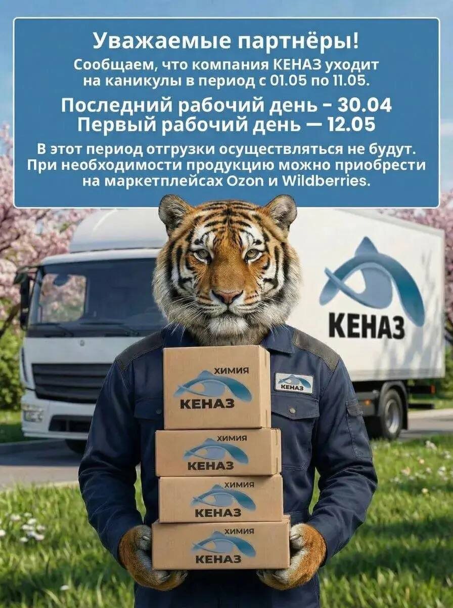 ! Компания «КЕНАЗ» уходит на майские каникулы с 1 по 11 мая включительно. Последний рабочий день - 30 апреля, а с 12 мая снова будем на связи. В это время отгрузки не проводятся, поэтому заранее напоминаем - самое время пополнить запасы! Приобрести продукцию «КЕНАЗ» во время каникул можно будет на наших маркетплейсах: Вайлдберриз Ozon Спасибо за понимание и сотрудничество!