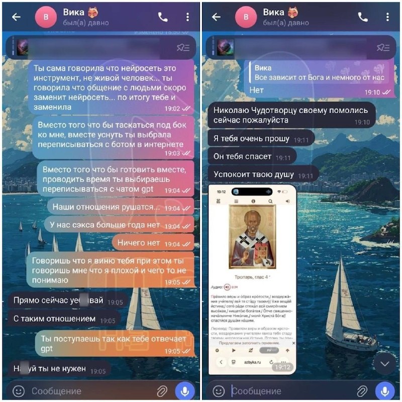 30-летняя Виктория пропала 4 дня назад. По словам близких, последний месяц она вела себя странно: всё время переписывалась с нейросетью, скрывала переписку и говорила, что «только GPT её понимает». Уволилась с работы, пыталась «изгонять бесов» из парня. Утром 1 апреля выбежала из квартиры подруги — и исчезла. Мама прилетела из другого города: у Виктории проблемы со щитовидкой и она нуждается в постоянных лекарствах. Семья написала заявление в полицию и обратилась к поисковикам. UPD: Викторию нашли. Сейчас она в больнице. PS Вспомнил старый ролик на тему общения с GPT