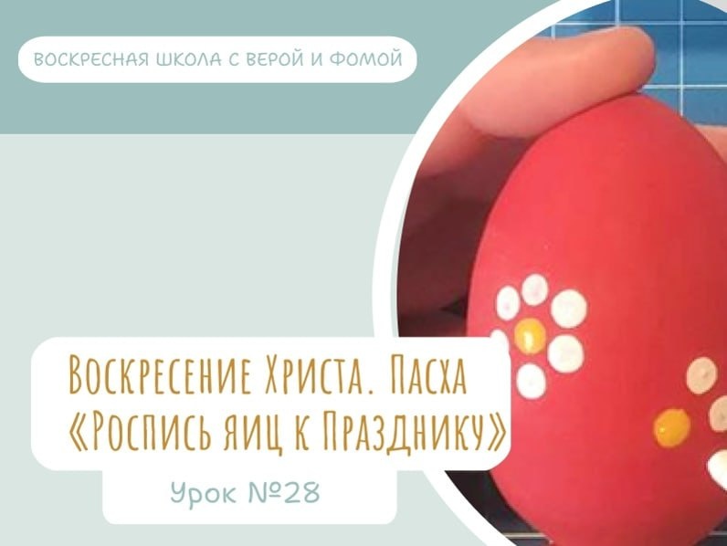 Занятие №28 «Воскресение Христа. Пасха» начинается со звона колокольчиков. Это связано с традицией, по которой на Пасху любой человек может звонить в колокола целую неделю. Это поможет создать радостное настроение ребятам и почувствовать радость Праздника. Творческое занятие в этот раз предлагаем провести в форме увлекательного мастер-класса «Роспись деревянных яиц к празднику Пасхи», на котором дети по праздничной пасхальной традиции распишут гуашью деревянные яйца. Получившиеся красочные изделия ребята могут забрать домой или оставить в воскресной школе для оформления «Пасхального дерева». В комплект входят сценарии занятий, презентации, практические задания для детей и методические рекомендации для учителя. Учебно-методические комплекты разработаны на основе аудиоспектаклей проекта «Вера и Фома». Материалы уже доступны на странице проекта. Их можно скачать и использовать на занятиях. Желаем вам Пасхальной радости на ваших уроках! Вопросы Веры и Фомы