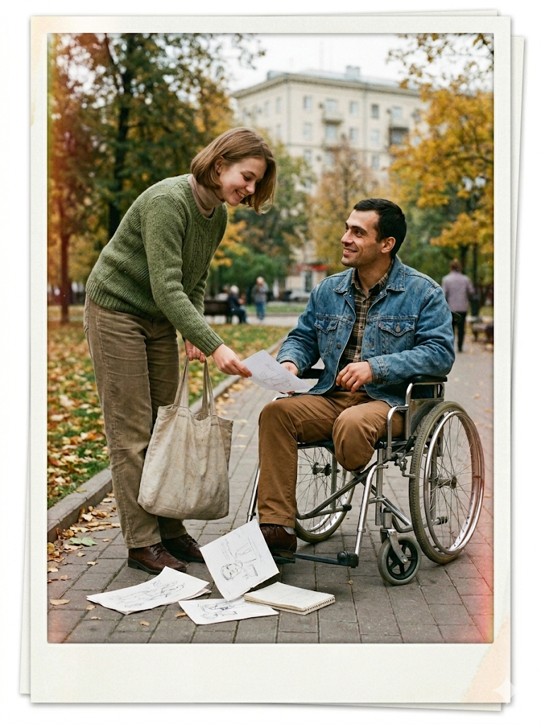 Весенний ветер сыграл с ней злую шутку. Возвращаясь после тяжелого зачета, Алина выронила папку, и эскизы ее дипломной коллекции разлетелись по мокрому асфальту, словно стая белых птиц. Она в отчаянии бросилась ловить непослушные листы бумаги, когда краем глаза заметила чужие руки, аккуратно собирающие ее рисунки. Подняв глаза, девушка замерла. Перед ней находился молодой мужчина с пронзительным, почти гипнотическим взглядом темных глаз. Его открытая улыбка могла бы растопить любые льды, но сердце Алины болезненно сжалось от другой детали: незнакомец сидел в инвалидном кресле.