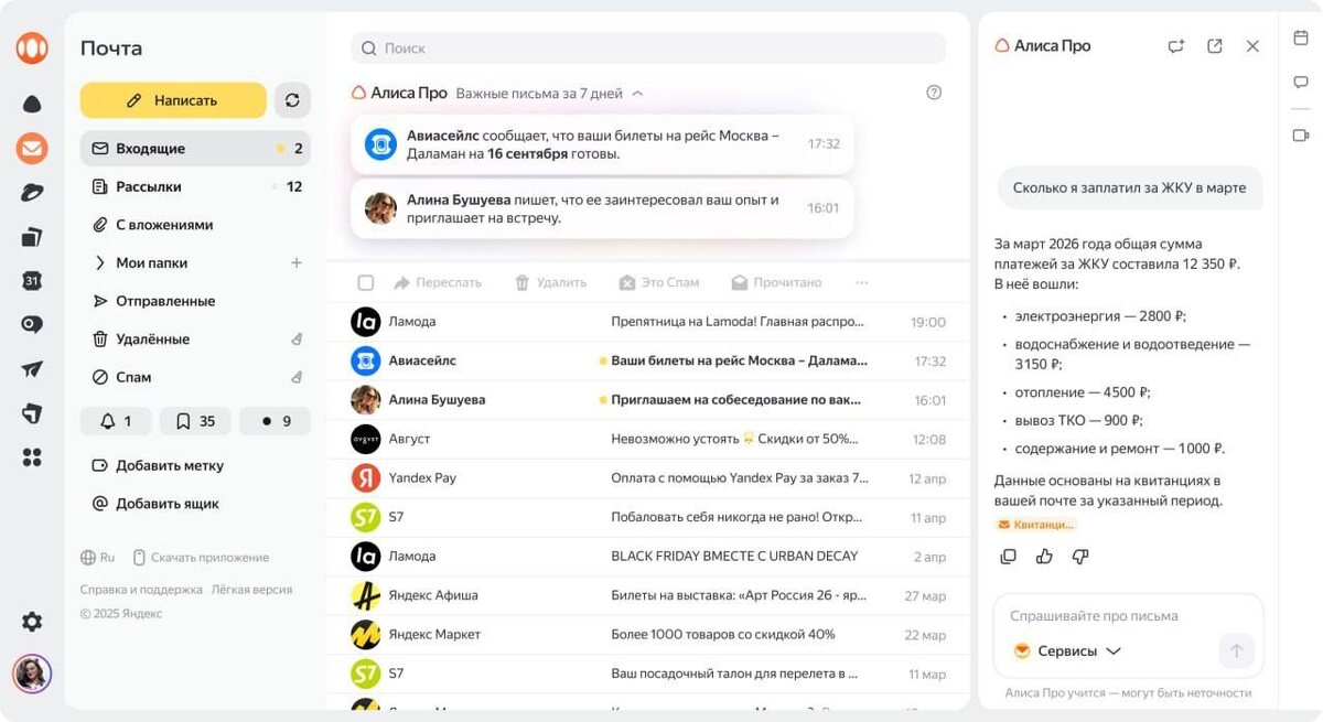 !! Новая штука в Яндекс Почте перевернула подход к работе с письмами — команда Яндекс 360 добавила в сервис ИИ-чат с Алисой Про. Что он может: — Понимать естественный язык общения; — Извлекать факты из писем и обобщать информацию по запросу; — Написать черновики писем; — Анализировать графики, диаграммы, PDF; — Искать нужные сведения в массивах информации и в интернете. Вам это поможет держать почту в порядке ? 💯 Перешлите своим знакомым и добавьте в избранное! 🗣Подпишись! Про Бизнес и ИИ 🤖 кто я? | закрытый чат по ИИ | курс по ИИ