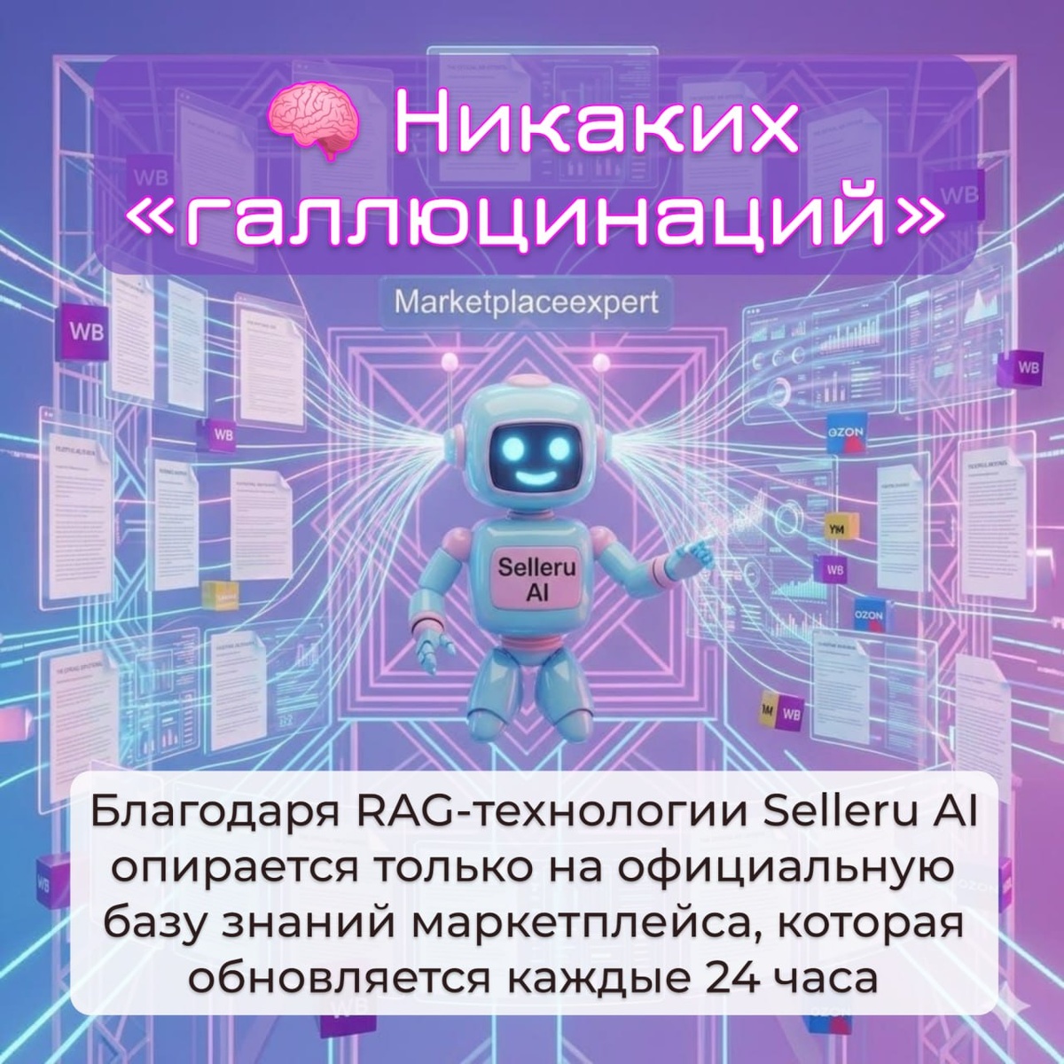 TG_POST 🧠 Никаких «галлюцинаций» Благодаря RAG-технологии Selleru AI опирается только на официальную базу знаний маркетплейса, которая обновляется каждые 24 часа. Попробуй 5 запросов бесплатно - проверь ИИ на самом сложном вопросе!