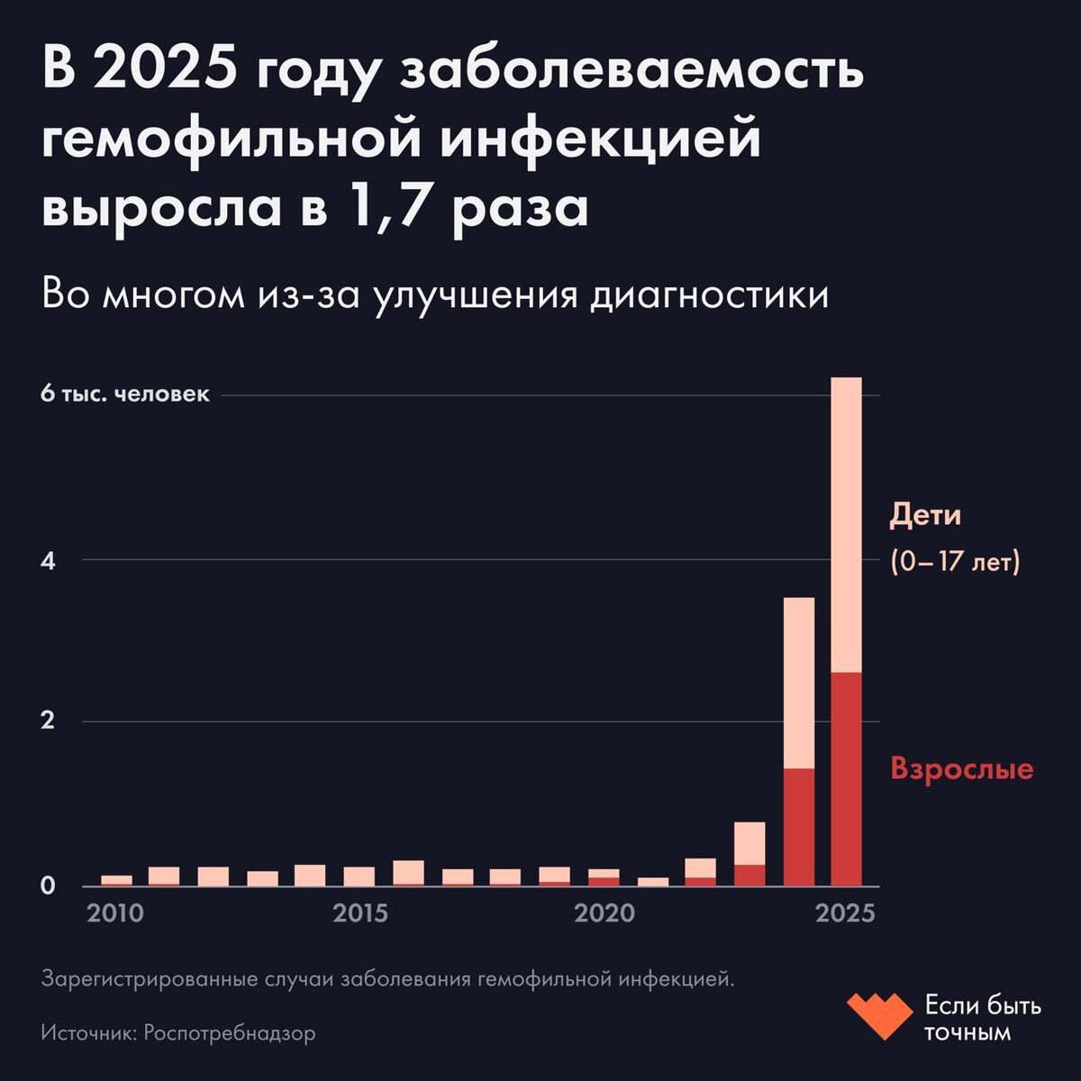 В 2025 году в России зарегистрировали рекордные 6,2 тысячи случаев гемофильной инфекции — почти вдвое больше, чем годом ранее. По сравнению с 2022 годом заболеваемость выросла в 18 раз. Это следует из данных Роспотребнадзора, на которые обратил внимание «Если быть точным». Самый сильный прирост зафиксирован в Татарстане (в 17 раз), Якутии, Осетии и Чувашии (примерно в 10 раз), но там это во многом эффект низкой базы. Более показательный рост — в Ставропольском крае (с 39 до 345 случаев), ХМАО (с 161 до 480) и Москве (с 638 до 1,2 тысячи). Возбудитель инфекции — гемофильная палочка (Haemophilus influenzae). Чаще всего она поражает дыхательные пути и вызывает пневмонию, бронхит, отит. В тяжелых случаях — менингит и сепсис. 🔸Рост объясняют улучшением диагностики. С распространением ПЦР-тестов, внедренных во время пандемии COVID-19, врачи стали точнее определять возбудителя пневмоний и других инфекций и чаще выявлять гемофильную палочку. Раньше такие случаи нередко относили к «неуточненны