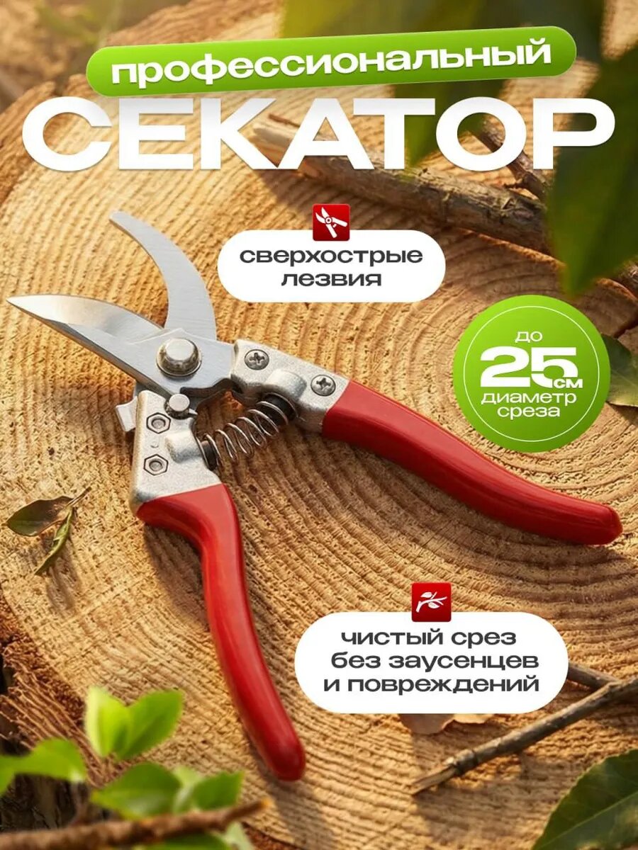 Универсальный секатор с пружинным механизмом — незаменимый инструмент для садоводов. Острые лезвия из высокоуглеродистой стали легко срезают ветки, не травмируя растения.