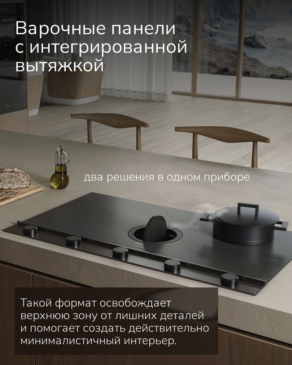 Техника, которая не перегружает интерьер, а аккуратно в него встраивается. В коллекции бренда сразу несколько вариантов для чистого и лаконичного дизайна кухни: Интегрируются в мебель и практически не привлекают к себе внимания. При этом сохраняется полноценная вытяжка и подсветка рабочей зоны. Формат, который буквально «растворяется» в пространстве. Такие модели встраиваются в потолок, освобождают обзор и поддерживают спокойный вид кухни. Линейка NikolaTesla объединяет варочную поверхность и систему отвода воздуха в одном приборе. Это удобно для современных кухонь-островов и пространств, где важно не перегружать верхнюю зону. Техника Elica для тех. кто хочет оставить в интерьере кухни только главное: линии, свет, материалы и ощущение порядка.