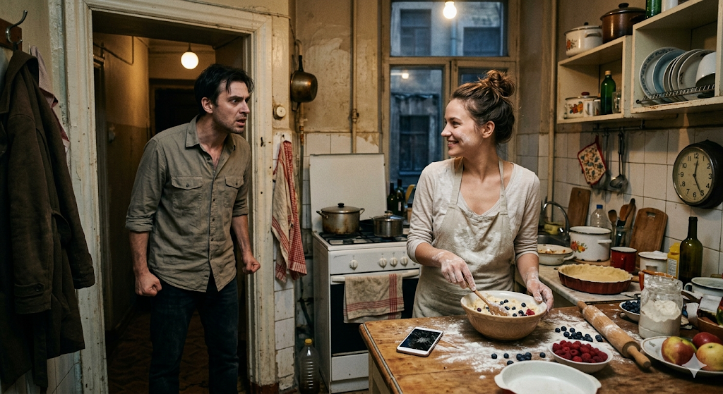 — Я сейчас всё организую на кухне, — сказала она, забирая продукты. Она схватила муку, сахар, ягоды и ушла в конец коридора, к общим плитам, совершенно забыв, что её смартфон остался лежать на комоде в нашей комнате.