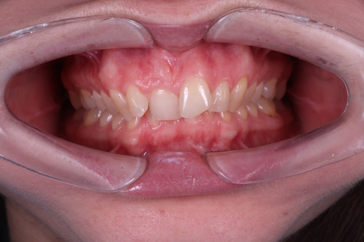 Лечение длилось около трёх лет и было направлено, в первую очередь, на устранение глубокого перекрытия. Мы работали над расширением зубных дуг, правильным наклоном зубов и гармонизацией прикуса. В процессе верхние зубы продолжали перекрывать нижние примерно на одну треть, сохранялось небольшое несоответствие центральных линий — но мы шли к цели шаг