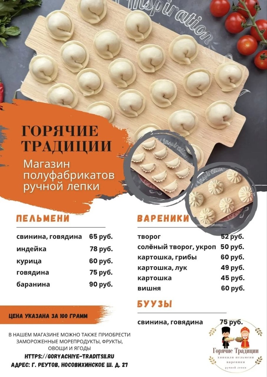 ! По адресу Носовихинское шоссе, дом 27 открылся новый магазин полуфабрикатов ручной лепки под названием «Горячие Традиции»! 🥟 Мы вручную готовим пельмени, вареники, хинкали, буузы, бёреги и манты исключительно из свежих и натуральных продуктов. ✅Наши изделия отличаются щедрой начинкой и настоящим домашним вкусом. ✅Рецепты имеют очень долгую историю и передавались из поколения в поколение, сохраняя традиции и аутентичность. ✅Мы не используем ГМО и усилители вкуса, чтобы гарантировать высокое качество и натуральность каждого блюда. Вы также можете приобрести в нашем магазине замороженные овощи, фрукты, ягоды и морепродукты! Телефон: +7 (927) 131-53-67 - пишите в мах Или тг @Maghjayev , @AlKervinski03 Ждем всех в гости! 💫