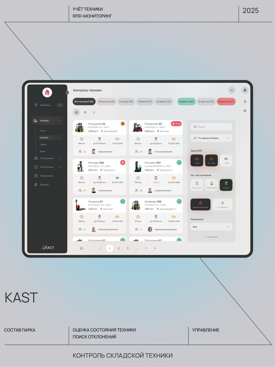 ). Опубликовано на Dprofile. Поддержка в виде лайков приветствуется 🙂 Здесь показан экран «Контроль техники» со списком машин и их текущими статусами. В процессе работы я реализовала логику отбора по типу техники и по состоянию машины, чтобы пользователю было ясно, что именно он отбирает. Отдельное внимание было уделено работе с карточками: какие данные нужны на общем экране для быстрого просмотра, а более подробные записи логично оставлять на странице конкретной машины, где уже собираются сервис, ремонт, заметки и история по технике. #фрагмент #проект #каст Дизайнер на всю голову