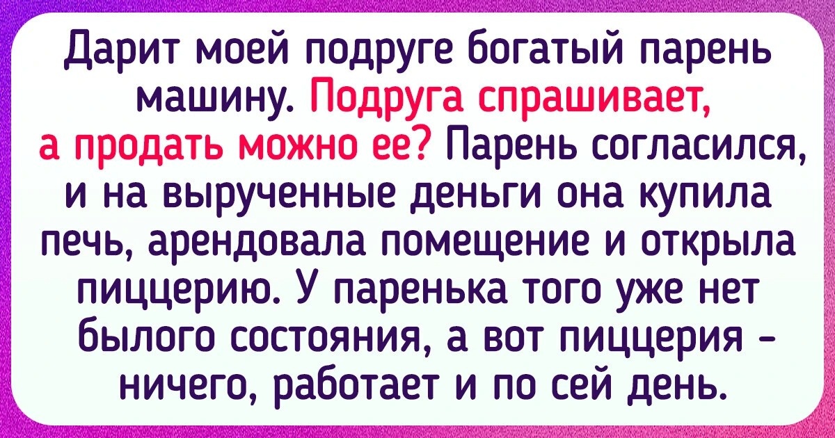 Дарит моей подруге богатый парень машину. Подруга спрашивает, а продать можно ее? Парень согласился, и на вырученные деньги она купила печь, арендовала помещение и открыла пиццерию. У паренька того уже нет былого состояния, а вот пиццерия — ничего, работает и по сей день.