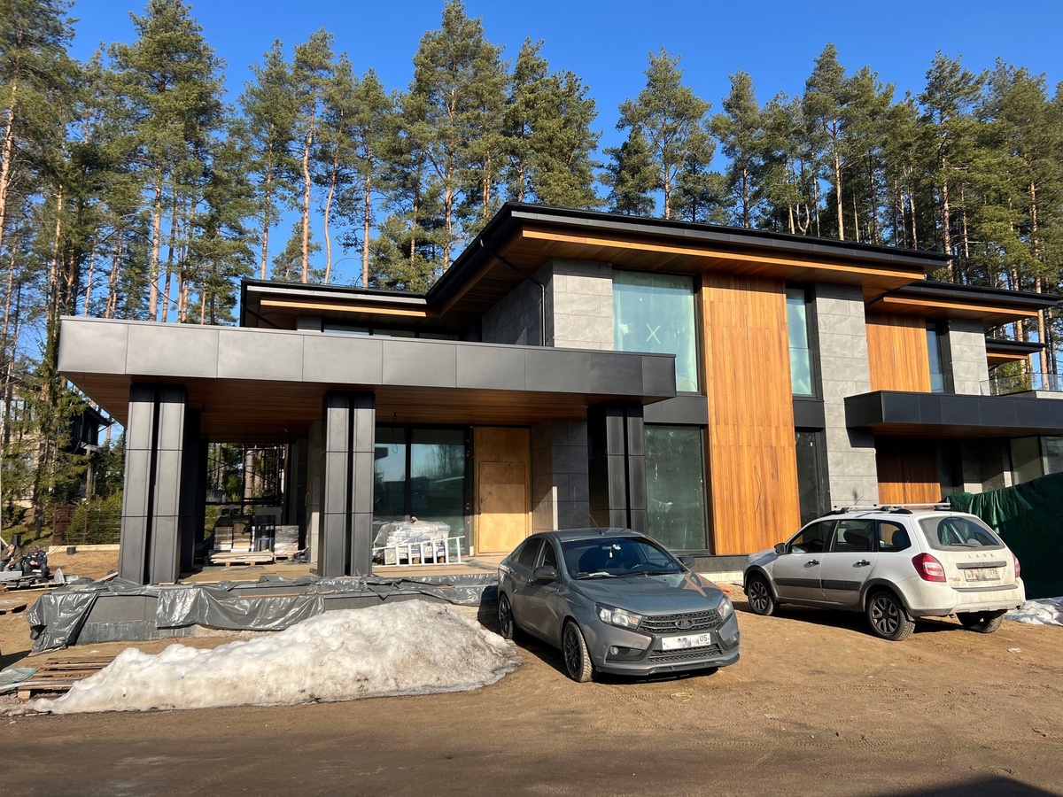 Для отделки фасада используются такие материалы, как деревянный планкен, керамогранит и черные металлокассеты, которые придают особую брутальность и монументальность дому.