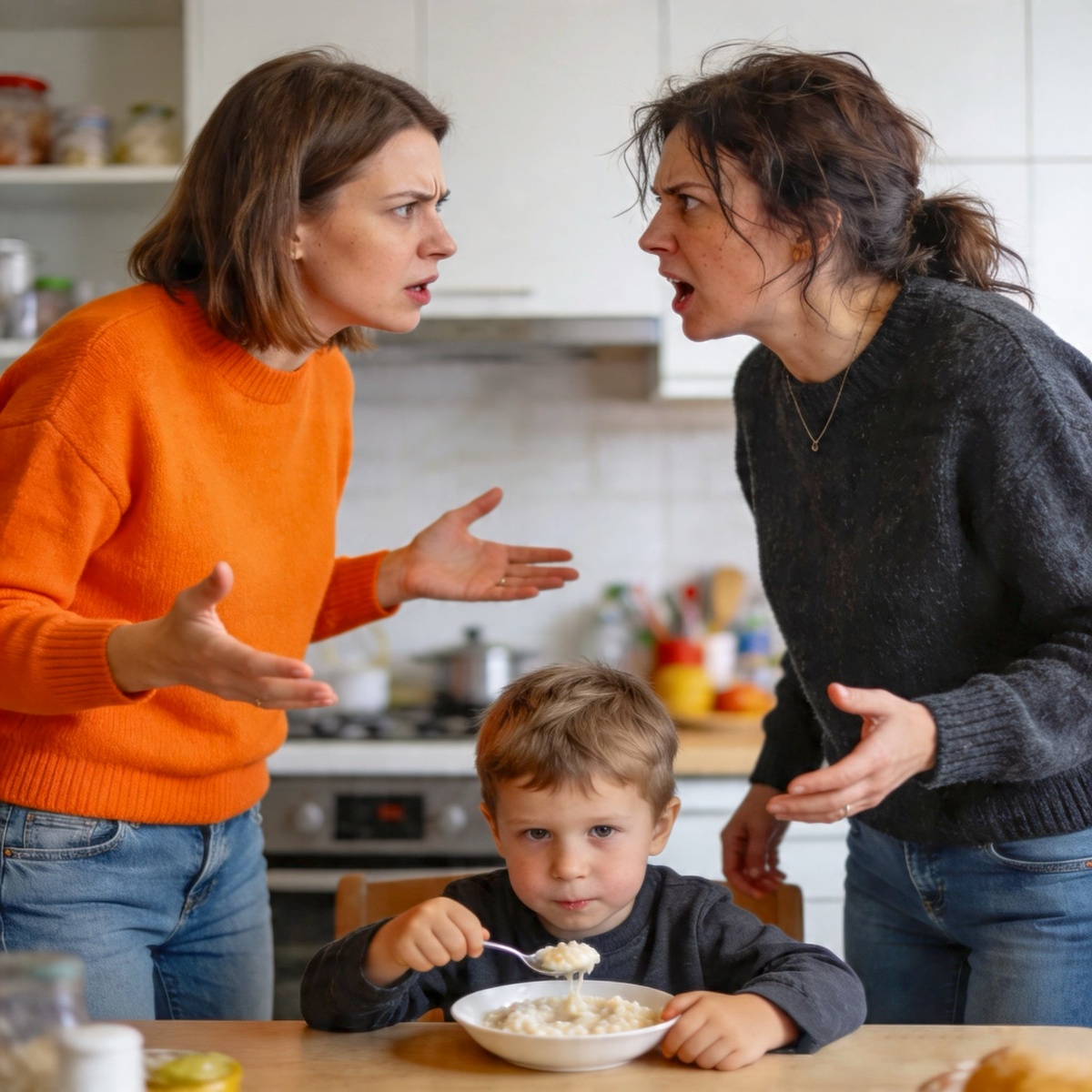 Мишка с тарелкой каши сидел между ними и смотрел то на одну, то на другую — и в его серьёзных глазах было что-то такое взрослое, такое тихо-испуганное, что у Елены сжалось сердце.