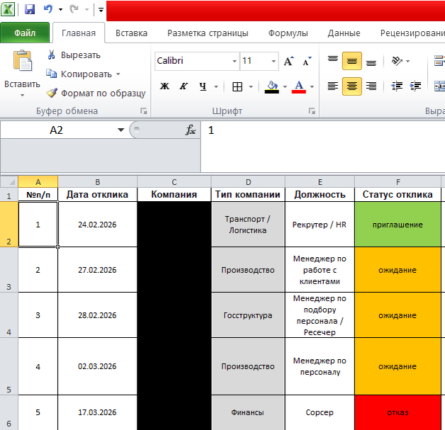 Это двадцать пятая статья из серии «Как я учусь сорсингу». Начало здесь: «Мой путь от госструктур к человеческому подходу». Я веду таблицу откликов и считаю response rate. Но мне захотелось большего: понять, в каких компаниях чаще отказы, а где есть надежда. Для этого я добавила колонку «Тип компании» и построила сводную таблицу. Делюсь инструкцией. Всё просто. Сводная таблица — это инструмент, который быстро считает, группирует и анализирует данные. Не нужно писать формулы. Всё делается в несколько кликов. В моём случае сводная таблица посчитала, сколько откликов, отказов и ожиданий по каждому типу компании (IT, производство, финансы, госструктура, образование, транспорт). Шаг 1. Подготовьте данные Ваша таблица должна быть структурированной. Первая строка — заголовки колонок. Никаких пустых строк внутри данных. Пример данных (как это выглядит в тексте): Шаг 2. Выделите данные Выделите всю таблицу вместе с заголовками (например, A1:H20). Шаг 3. Вставьте сводную таблицу На вкладке «Вст