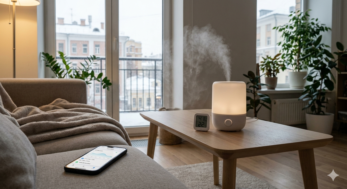 Умный дом: когда увлажнитель сам знает, что пора работать Зима в России — это время, когда наши квартиры превращаются в «пустыню». Виной тому отопление: батареи жарят, влажность падает до 15–20%, и вот мы уже просыпаемся с заложенным носом и сухой кожей. Многие решают проблему покупкой увлажнителя. Но тут начинается новая суета: прибор надо постоянно включать и выключать, следить за уровнем воды и бояться, что он превратит комнату в туманные джунгли, если забудешь его выключить. Рассказываем, как сделать так, чтобы техника сама следила за климатом, пока вы отдыхаете. В чем беда обычных увлажнителей? У большинства увлажнителей есть встроенный датчик влажности. Казалось бы — живи и радуйся! Но на деле этот датчик находится прямо у «источника пара». Представьте: прибор выпустил струю влаги, она сразу попала на его же датчик. Увлажнитель «подумал», что в комнате уже тропики, и отключился. А на самом деле у вашей кровати в паре метров от него всё еще сушь. Или наоборот: прибор работает без