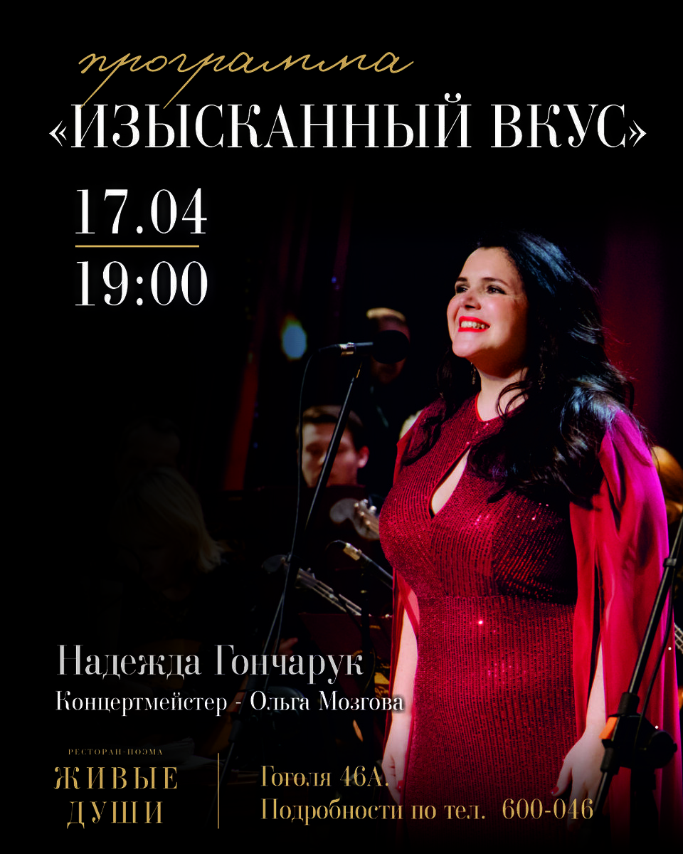 «Живые души» приглашают вас отправиться в путешествие, где вино и культура гармонично сплетаются воедино. 17 апреля музыкальными гостями будут солистка Великорусского народного оркестра «Сибирь» Надежда Гончарук и концертмейстер Ольга Мозгова. Вас ждут в эту пятницу в 19:00 на Гоголя, 46а в городе Б. Бронь столов на музыкальный вечер по телефону: 600-046. 18+. Реклама, ООО «Ин Вино». Erid: F7NfYUJCUneTVwbAAeB5