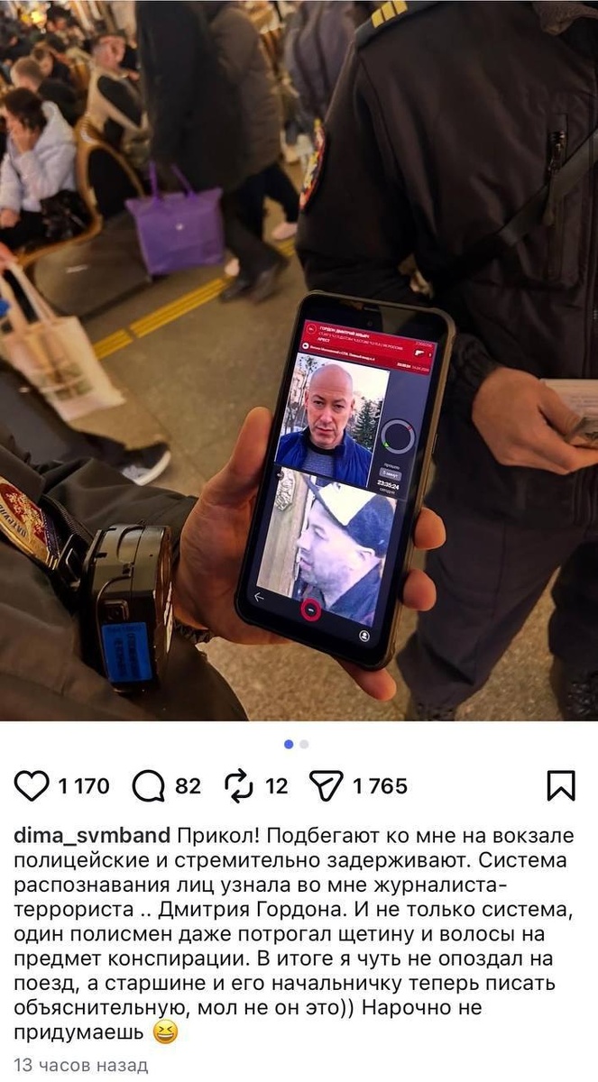 Система распознавания лиц выдала стопроцентное совпадение, и полиция «приняла» опасного рецидивиста прямо у вокзала. Вот только вместо иноагента в руки силовиков попал местный музыкант Дима Галяминских. ⠀ Задержание превратилось в проверку на подлинность. Один из сотрудников даже лично потрогал щетину и волосы Димы, чтобы убедиться — это не парик и не хитрая маскировка. Музыканта в итоге отпустили, но осадочек и внезапная слава остались. ⠀ *Признан иноагентом, террористом и экстремистом в РФ