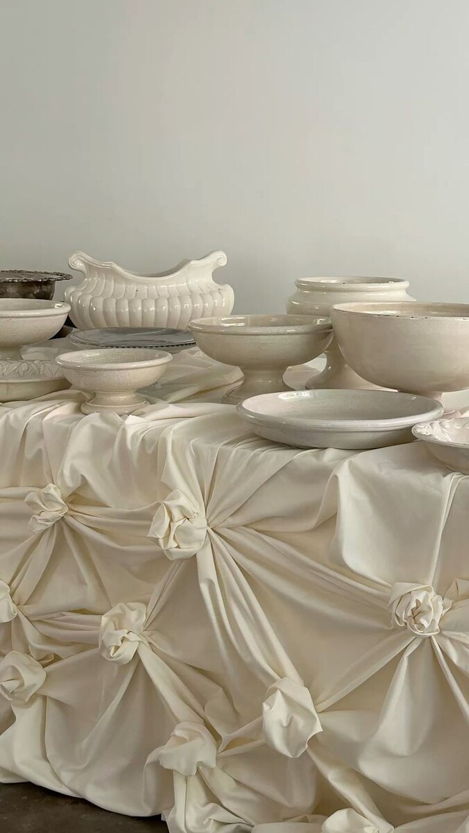 Ткань в этой палитре - не просто функциональный элемент, а полноценный участник декора. Органза, шёлк, шифон, лён - каждая фактура рассказывает цвет по-своему. Драпировки, мягкие складки скатертей, невесомые тканевые дорожки вдоль столов - всё это работает на создание того самого ощущения «красивой лёгкости». А кружево добавит романтики, если она вам близка.