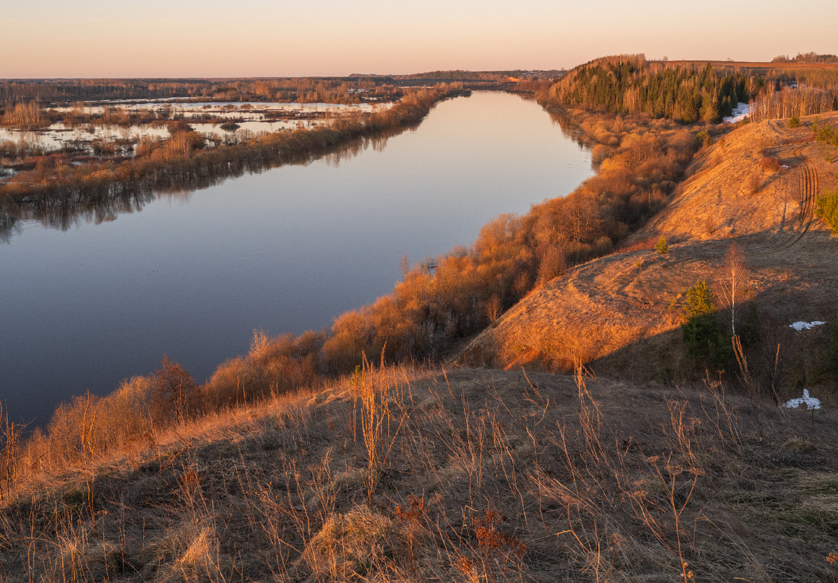 Когда заходит речь о красоте русской природы, многие представляют бескрайние леса или цветущие луга. Но есть особенная пора — «рыжий» апрель. Это время, когда снег уже сошёл, а первая трава ещё не пробилась сквозь прошлогодние золотистые стебли. Магия Вятских круч На берегах реки Моломы сейчас удивительно. Солнце в это время года ходит низко, и в предзакатный час его лучи буквально зажигают берега. Сухая трава на высоких склонах превращается в драгоценный ковёр, а сама река, наполнившись талыми водами, неспешно несёт свои синие воды, отражая мирное небо. Цвет весны Для фотографа это — «золотой» период. Здесь не нужно искать ярких красок, природа сама создаёт идеальное сочетание: глубокая синева воды и тёплый, медный цвет земли. В этом контрасте чувствуется мощь пробуждения и в то же время удивительный покой. Такие пейзажи не кричат о себе, они шепчут. Чтобы их увидеть, нужно уметь замедляться и смотреть на привычные вещи под новым углом. Разлив на Моломе — это напоминание о том, как ве
