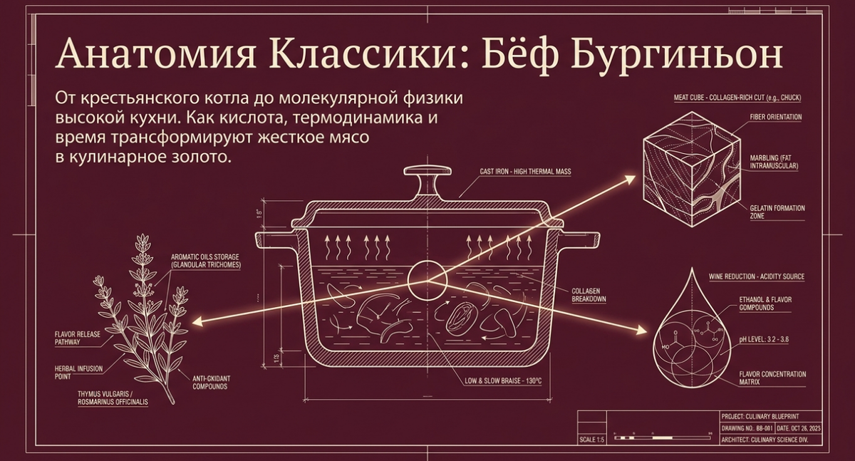 Bonjour, мои дорогие гурманы! Присаживайтесь поближе к огню. Сегодня мы не просто готовим ужин, мы создаем шедевр, который заставляет сердца биться чаще, а желудки — петь «Марсельезу». Запомните: хорошее вино в кастрюлю — праздник в дом, а наше сегодняшнее блюдо — это сам дух Франции, запертый в чугунном котелке. 👨🍳 История Бёф Бургиньон — это захватывающий путь преображения. Когда-то блюдо было основой рациона бургундских фермеров. В те времена для приготовления использовали доступные части говядины, которые требовали особого подхода из-за своей природной жесткости. Но французские кулинары нашли гениальное решение: они заметили, что если долго томить мясо в местном красном вине, магия вкуса и времени превращает его в нежнейшее лакомство, тающее во рту. Так рецепт веками созревал в уютных домашних печах, пока в начале XX века его не оценил «король поваров и повар королей» Огюст Эскофье. Он довел деревенскую классику до совершенства, выверил пропорции и представил ее в меню лучших ре