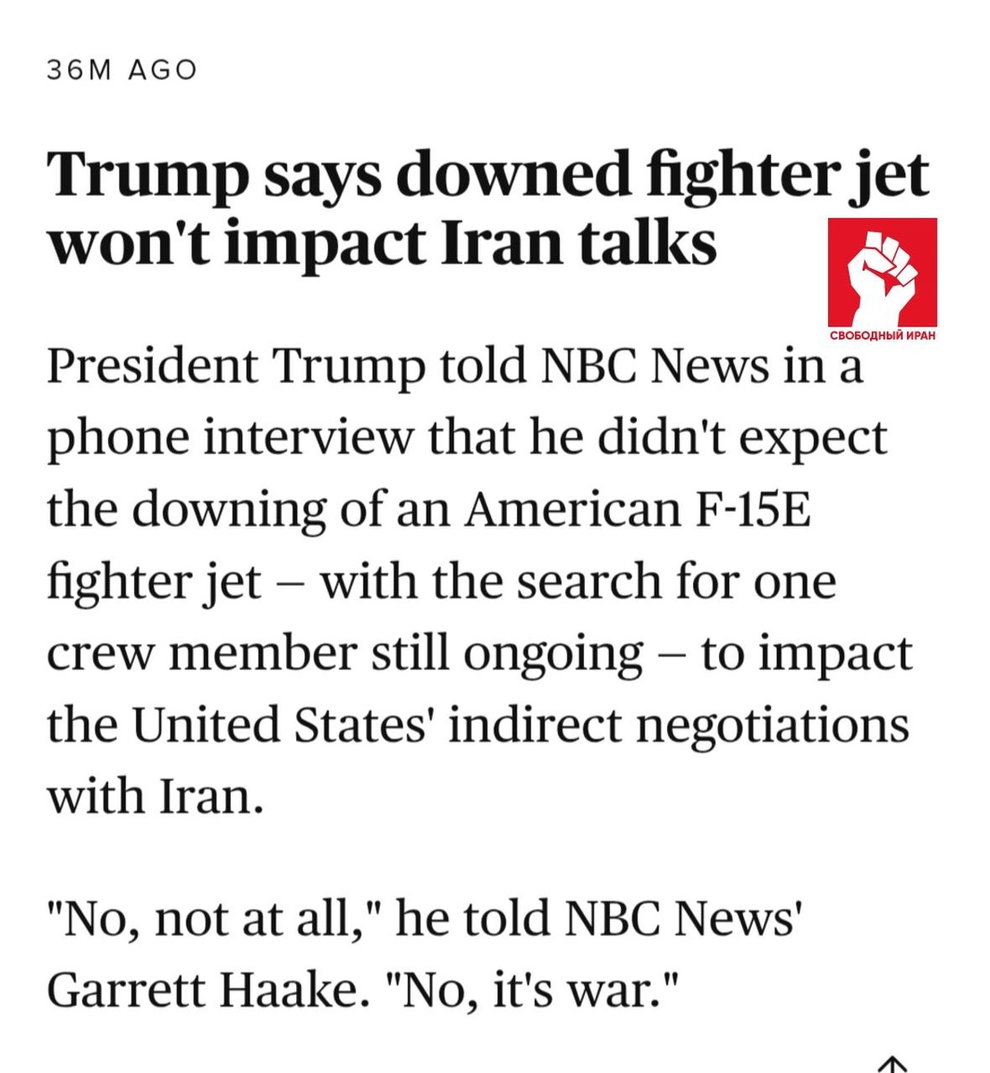 Президент США заявил NBC News, что инцидент не повлияет на возможные переговоры с 🇮🇷 Ираном. По его словам, это война, и США находятся в состоянии войны. Детали поисково-спасательной операции пилота он раскрывать отказался.