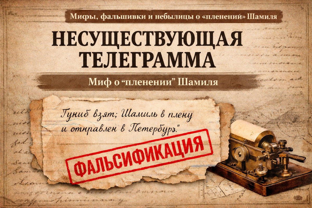В качестве подтверждения фабрикаций о «пленении» Имама Шамиля переписчики истории – «шамилееды» приводят ссылки на несуществующую телеграмму, отправленную с Гуниба, якобы от имени князя А.И. Барятинского императору Александру II 26 августа 1859 г. «Гуниб взят; Шамиль в плену и отправлен в Петербург». Оригинала телеграммы не существует – поскольку телеграфной связи на Кавказе в то время еще не было. Заведомо ложная фабрикация-небылица придворных летописцев «с низкой социальной ответственностью». Телеграмма генерал-адъютанта князя Александра Ивановича Барятинского – главнокомандующего Кавказской армией, наместника на Кавказе – императору Александру II о «пленении» Имама Шамиля – документ величайшего политического и государственного значения. Он должен фиксироваться каждым подразделением бюрократического аппарата царской России: Такие официальные документы юрисдикции императора России должны немедленно копироваться каждой инстанцией и приобщаться к соответствующим делам. Если гипотетическ