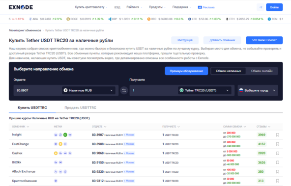 Exnode - сайт-мониторинг криптообменников