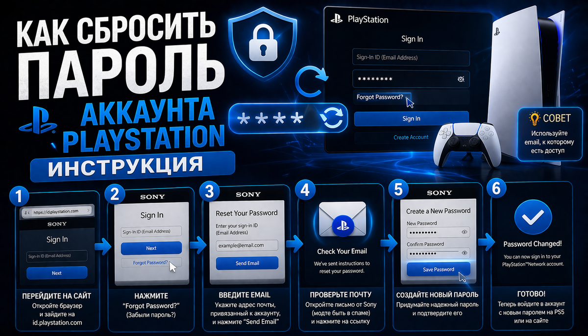КАК СБРОСИТЬ ПАРОЛЬ АККАУНТА PLAYSTATION — ИНСТРУКЦИЯ Кратко: Забыли пароль от PSN — не проблема. Нажмите «Забыли пароль» на экране входа, введите email, получите ссылку для сброса. Занимает 1-2 минуты. Работает через консоль, браузер и PS App. Видеоинструкция: смотрите наше видео (1:02) — весь процесс наглядно. Когда нужно сбрасывать пароль • Забыли пароль и не можете войти • Купили аккаунт и хотите установить свой пароль • Подозреваете, что кто-то узнал ваш пароль • Аккаунт заблокирован после нескольких неудачных попыток входа Сброс через браузер (самый удобный) 1. Откройте store.playstation.com 2. Нажмите «Войти» 3. Нажмите «Проблемы со входом?» → «Сбросить пароль» 4. Введите email аккаунта 5. Проверьте почту — придёт письмо со ссылкой 6. Перейдите по ссылке, введите новый пароль 7. Готово — войдите с новым паролем Письмо приходит в течение 1-5 минут. Проверьте папку «Спам», если не видите во входящих. Сброс через консоль PS5 1. На экране входа выберите свой аккаунт 2. Нажмите «Забы