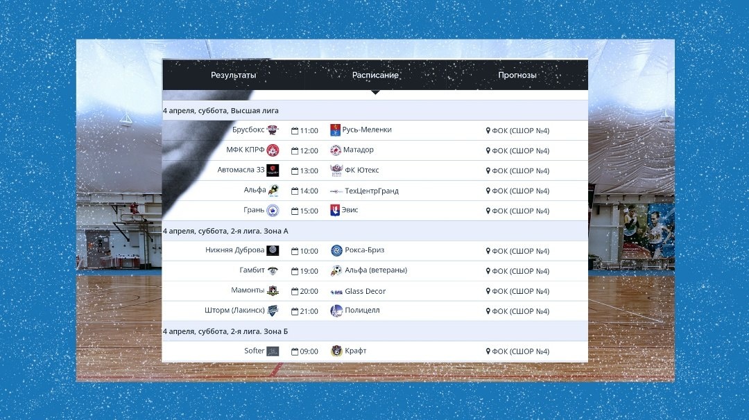 🏟 ФОК (СШОР №4) г. Владимир 🏆 Чемпионат Владимира по футзалу. Высшая лига. 🏟 ФОК (СШОР №4) г. Владимир ⚽ Первенство Владимира по футзалу. 2-я лига. Зона А. 2-я лига. Зона Б. 🏃♂🏃♀ Приглашаем болельщиков на трибуны поддержать свою команду! 📺 Следите за анонсами трансляций! befutsal.ru/