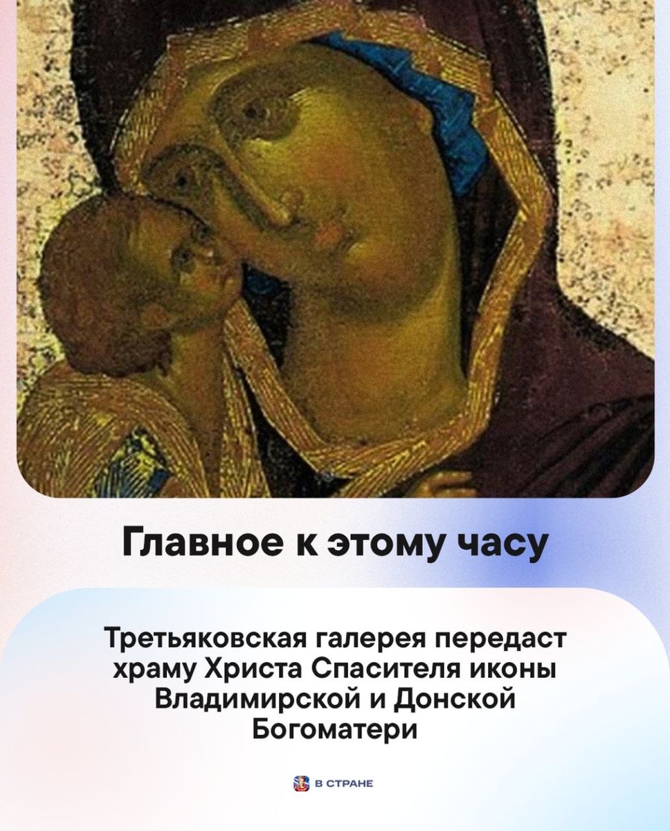 : 🔹Третьяковская галерея передаст храму Христа Спасителя иконы Владимирской и Донской Богоматери. 🔹Оперативники задержали двух мужчин, которые по заданию анонима планировали поджечь электроподстанцию в Батайске Ростовской области. 🔹Оценку за поведение могут ввести во всех школах с 1 сентября 2027-го, сообщила замглавы Минпросвещения Ольга Колударова. 🔹В Минтрансе заявили о готовности к партнерству с Африкой в сфере транспорта. 🔹В Москве в 2026 году пройдут испытания первого человекоподобного робота-курьера. ✅ «В Стране» в MAX
