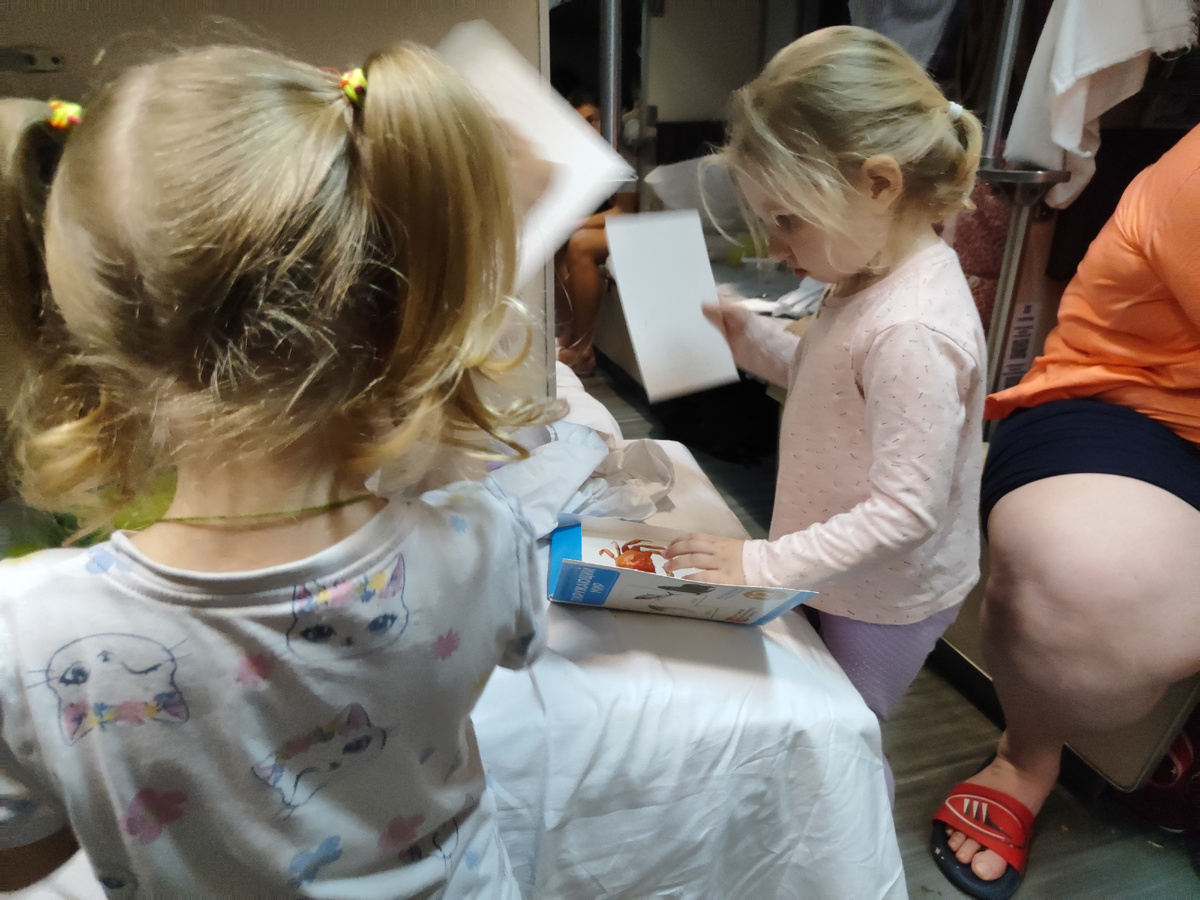 Я вам уже рассказывала в прошлой статье, что оказалось, что в вагоне нет кондиционера, и это реально стало напрягать, хотя еще никакой жары в помине нет. Видимо вентилятор не справлялся или не работал. Такие вагоны нельзя пускать в Крым - это ужасно просто. Как вам писала также в Россоши села семья с девочкой возраста Маши, и они оказались нашими соседями. Дочка была счастлива! А так как они ехали составом бабушка, мама и дочка и у них были две полки, а у нас с дочкой две полки, то само собой девочка пришла играть к нам. Ведь у дочки целая своя полка. И я могу спокойно лежать и читать. Красота! Кстати первое время Мария не могла запомнить имя девочки Верника и называла ее Пирамидка.)) Это надо было видеть. Они сидят ужинают, а дочка поет Пирамидка моя, Пирамидка, иди ко мне, Пирамидка! Потом запомнила имя и называла правильно Вероника.)) Девчонки игрались очень здорово. Столько радости было у них и никому не мешали, так как были на полке и не шумели. В какой-то момент дочка предло