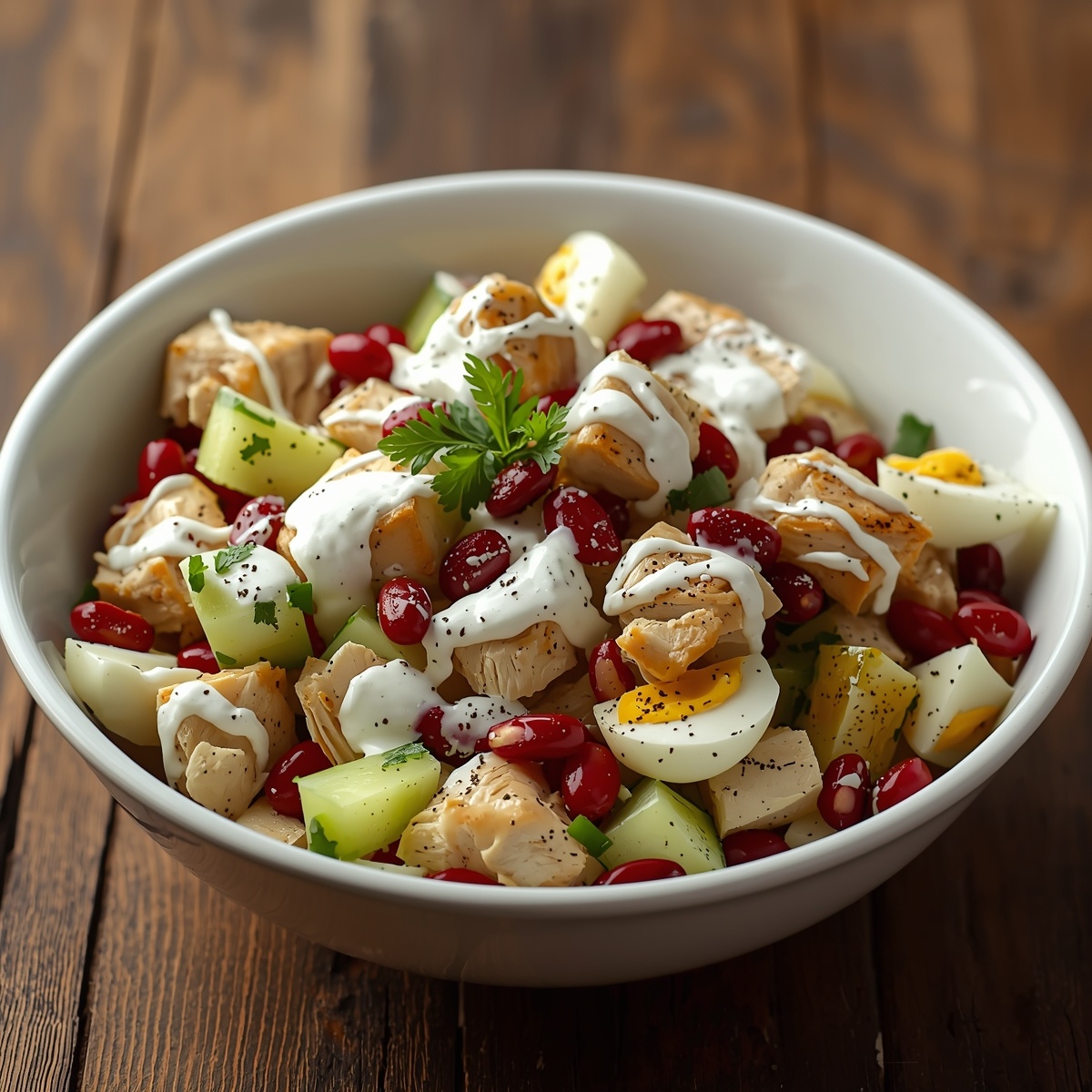 Этот салат — настоящий маст-хэв для тех, кто ценит вкус, пользу и время. В нём идеальный баланс: курица и фасоль дают сытость и белок, яйца — нежность, солёный огурец — пикантность и хруст, свежий огурец — свежесть, а йогурт с чесноком объединяет всё в бархатистую заправку без лишних калорий.