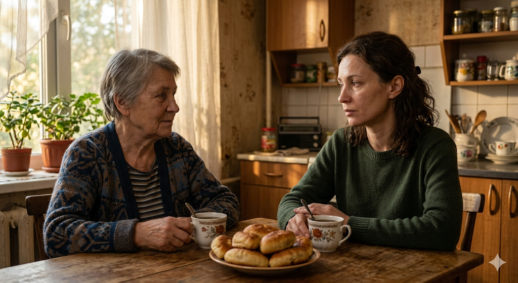 Когда Сергей вернулся вечером, он нашёл жену и мать за столом с пустой тарелкой и двумя кружками. Они разговаривали — без привычного напряжения, которое он научился чувствовать ещё с порога. Просто разговаривали, как два человека, которые наконец решили посмотреть друг на друга без заранее заготовленных претензий.