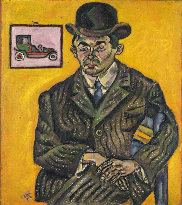 «Здесь, в Барселоне, нам не хватает смелости», — писал Жоан Миро-и-Ферра (1893–1983) в конце 1917 года своему коллеге по мастерской Энрику Рикарту (1893–1960). Мы, молодое поколение, могли бы собираться вместе и выставляться каждый год, все вместе под названием «Салон „Желтый хром“», например, и произносить энергичные манифесты… Мы должны быть людьми дела. В течение следующих нескольких месяцев Миро, Рикарт и несколько их соратников действительно объединились, но не как группа «Желтый хром», а как «Курбе», в честь французского реалиста XIX века, известного тем, что провоцировал споры на официальных выставках. Несмотря на свою преданность современной французской живописи, «Курбе» были привержены как каталонской традиции, так и радикальным живописным новшествам. Среди трёх работ, представленных Миро на первой совместной выставке «Курбе» в 1918 году, был и этот портрет его друга по художественной школе Эриберто Казани, с его тонкими пальцами и волнистыми складками на твидовом пиджаке.