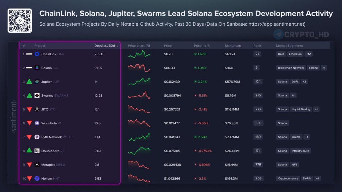 📊 Santiment: ТОП-10 криптопроектов экосистемы Solana по активности разработчиков за последние 30 дней. 1. ChainLink #LINK 2. Solana #SOL 3. Jupiter #JUP 4. Swarms #SWARMS 5. JITO #JTO 6. Wormhole #W 7. Pyth Network #PYTH 8. DoubleZero #2Z 9. Metaplex #MPLX 10. Helium #HNT Ранее: прошлый топ Сryptо Headlines