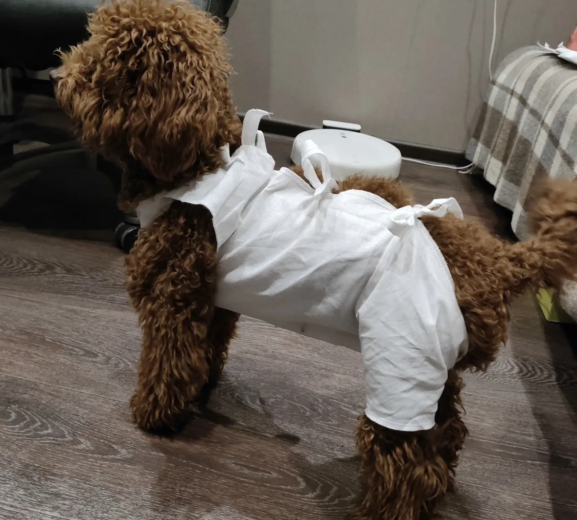 Рич чесал это место, лизал его, не оставлял в покое. Мы надели ему воротник, но быстро поняли, что этого недостаточно. Потому что Лео тоже всё время пытался лизать ему эту болячку. В итоге приходилось надевать ещё и бандаж, а снимать всё это только на улицу.