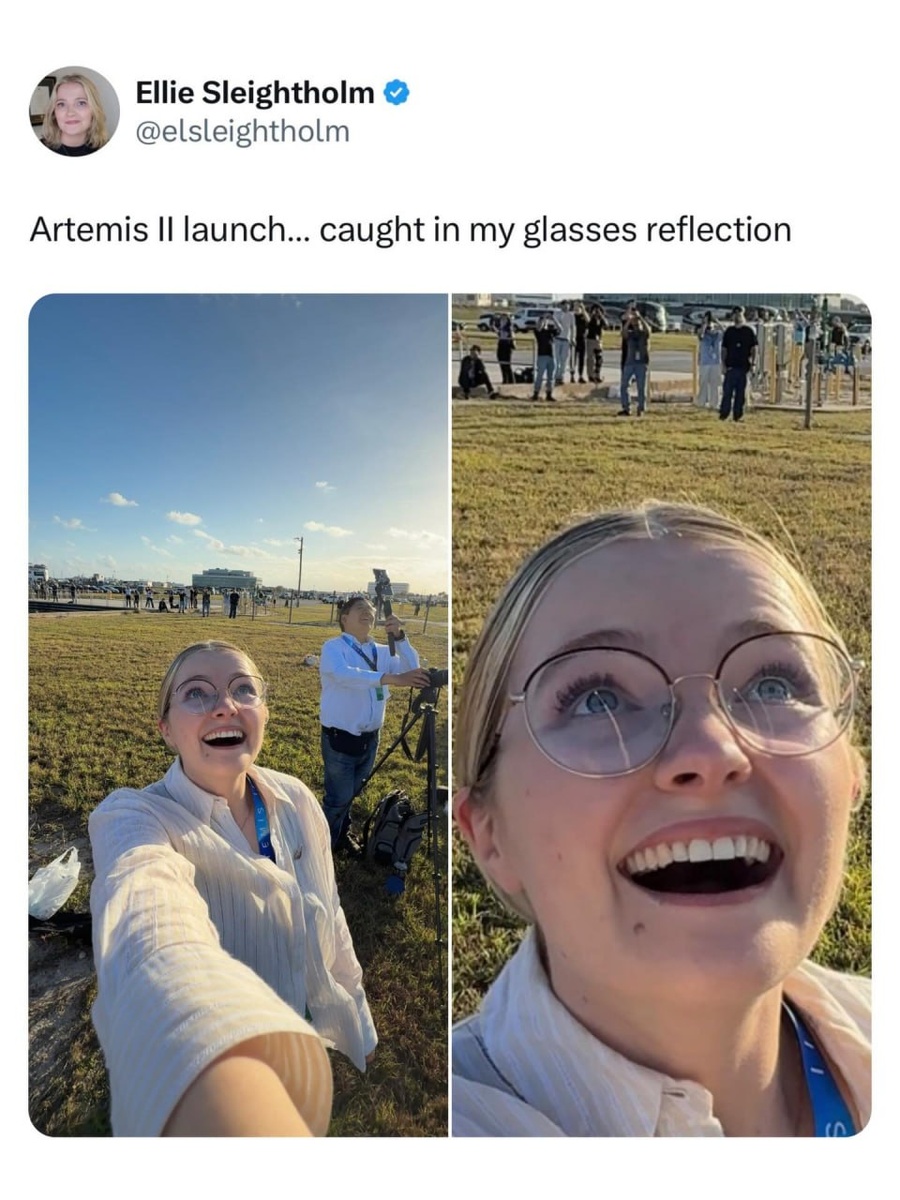 Блогерша запечатлела исторический момент запуска миссии Artemis II! 🚀 Она «поймала» ракету в отражении своих очков — и, конечно, не смогла