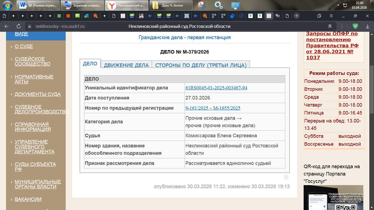 Есть дело № 33-5188/2026 АПЕЛЛЯЦИОННОЕ ОПРЕДЕЛЕНИЕ от 12 марта 2026 года Ростовского областного суда в составе судьи Хомич С.В. по моему обращению. Гражданские дела – апелляция ДЕЛО № 33-5188/2026 страница: https://oblsud--ros.sudrf.ru/modules.php?name=sud_delo&srv_num=1&name_op=case&case_id=71246885&case_uid=a96dad4a-61f6-4e7c-965b-79bb45647975&result=0&delo_id=5&new=5 Судья в определении ссылается: на Конституцию РФ каждому гарантируется судебная защита его прав и свобод (ч. 1 ст. 46). - Так, в материалах дела отсутствуют доказательства, свидетельствующие о реальном направлении в адрес заявителя копии определения об оставлении заявления без движения. При этом, сопроводительное письмо, имеющееся в материалах дела (л.д. 8), в отсутствие иных почтовых документов (почтовое уведомление, конверт с отметками организации почтовой связи, почтовый реестр, почтовый идентификатор), не может являться надлежащем доказательством направления копии определения заявителю. - Исходя из изложенного, опре