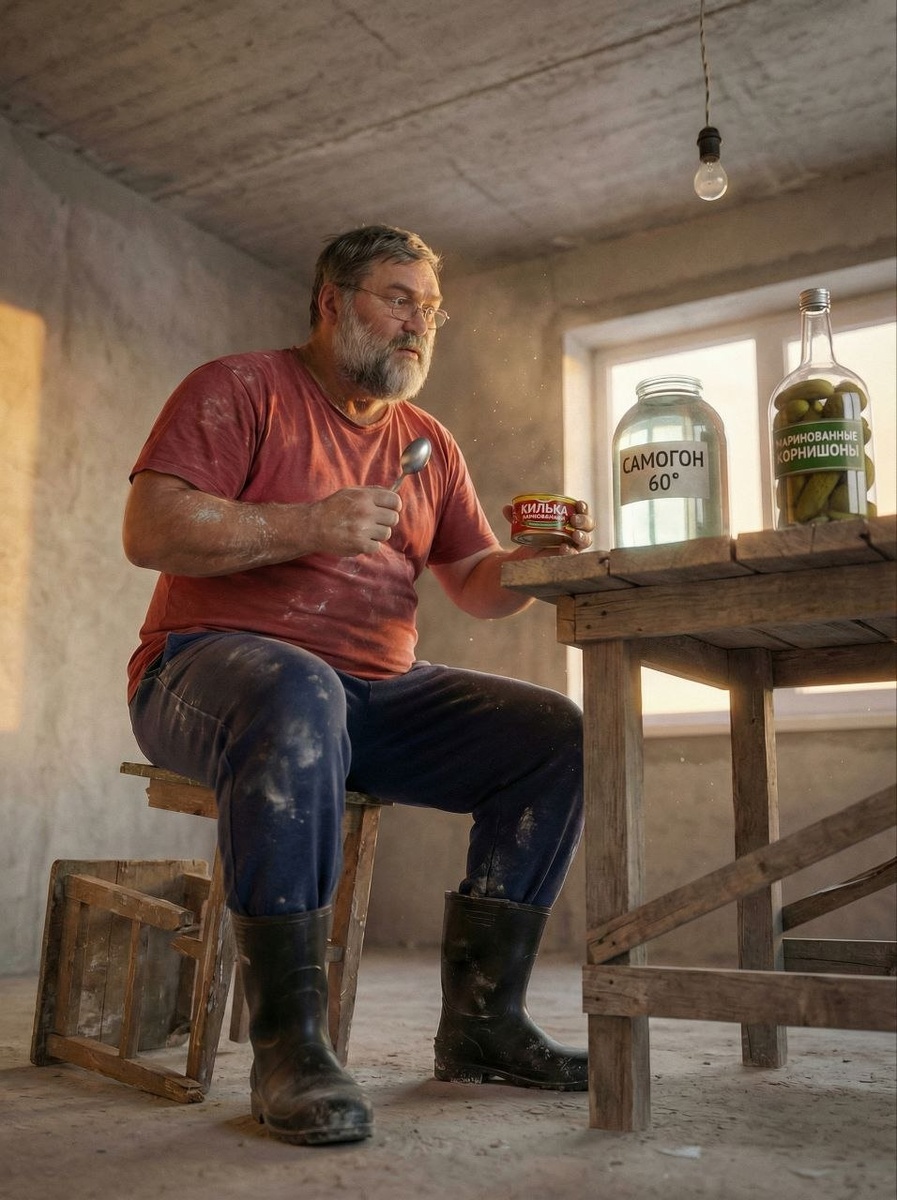Продолжаем пятничное настроение. От подписчика @UjinGr портрет мужчины, черты лица точно перенесены с загруженных референсных фотографий — сохранить форму лица, глаз, носа, губ и общий облик максимально точно. Мужчина сидит на старой табуретке со сломанной одной ножкой в пустой комнате без ремонта, с голыми стенами и потолком, новый только сданный дом. Смотрит на стол с надеждой и лёгкой тревогой, на котором стоят бутылка и банка. на нём, старые растянутые темно-синие спортивные штаны, и растянутая красная, на уже выцветшая футболка, на ногах обрезанные, резиновые сапоги черного цвета. Вся одежда в строительной пыли. Стол самодельный, сбитый из досок В одной руке ложка, в другой не вскрытая банка кильки в томатном соусе, перед ним стоят: Литровая бутылка из под водки с маринованными огурцами и литровая стеклянная банка с прозрачной жидкостью. На бутылке этикетка - маринованные корнишоны, на банке - самогон 60 ⁰ Композиция: главный объект — мужчина, расположен по центру кадра, слегка