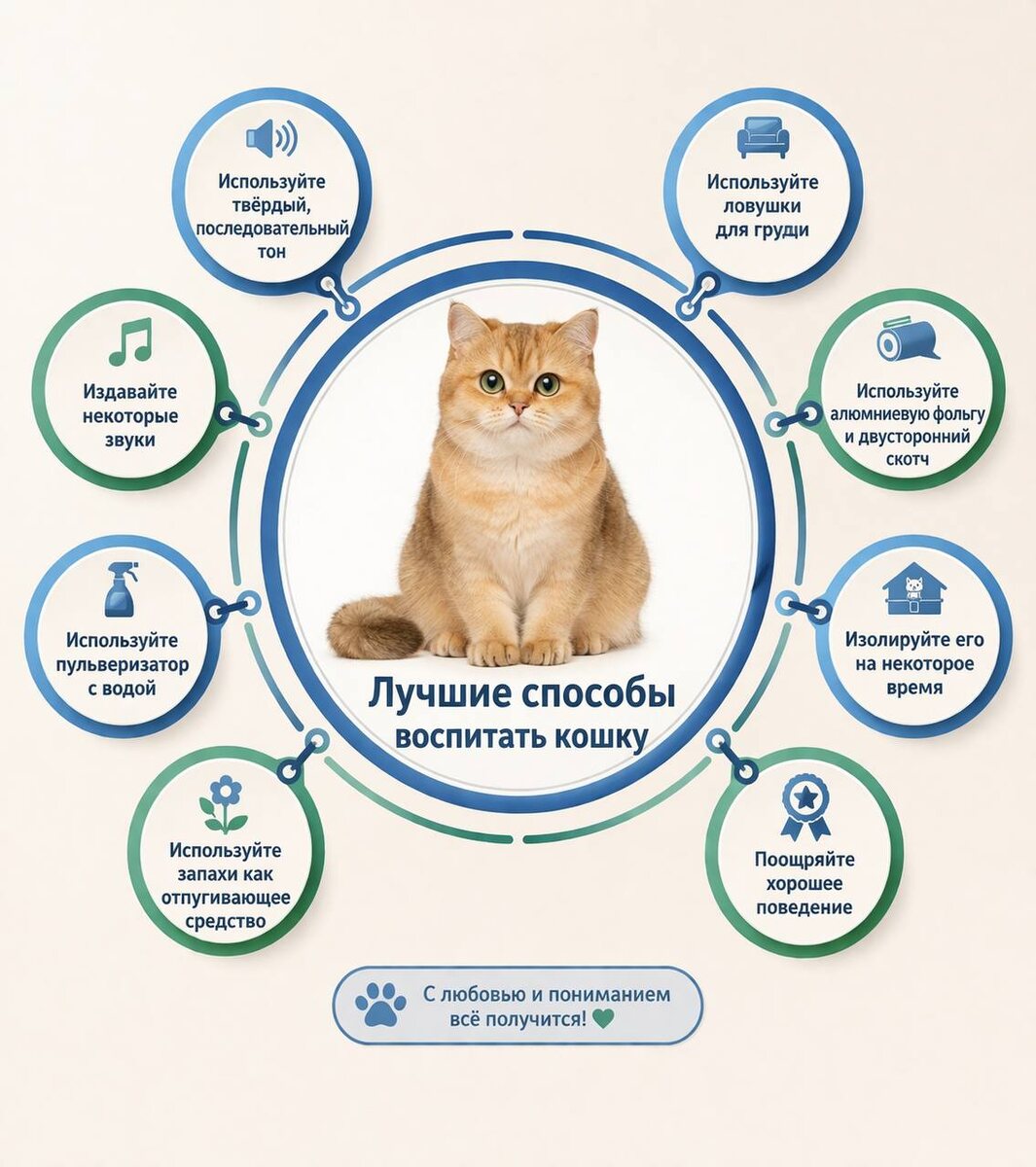На картинке собраны популярные «советы по дисциплине». Проблема в том, что половина из них либо бесполезна, либо портит поведение. Разберём по делу. Я, благодаря своему богатому опыту в кошковедении, понимаю, почему тема «воспитания» всегда вызывает споры. Потому что у кошек нет той логики, к которой мы привыкли. И если действовать по человеческой модели, результат будет слабый или временный. Разберу основные методы, которые обычно советуют, и как они работают на практике у меня с моими кошками. Следите за иллюстрацией, и отмечайте правильное галочкой, неправильное крестиком. Твёрдый тон Я использую, да. Кошки прекрасно считывают интонацию. Резкий, короткий голос может остановить действие. Но это, конечно, не обучение. Это именно сигнал «сейчас нельзя». Если дальше ничего не меняется, поведение возвращается. Шум Тот же принцип. Хлопок, резкий звук — кошка прервалась. Через какое-то время повторит снова, если не изменены условия. Это инструмент для момента, а не для системы. Пуль