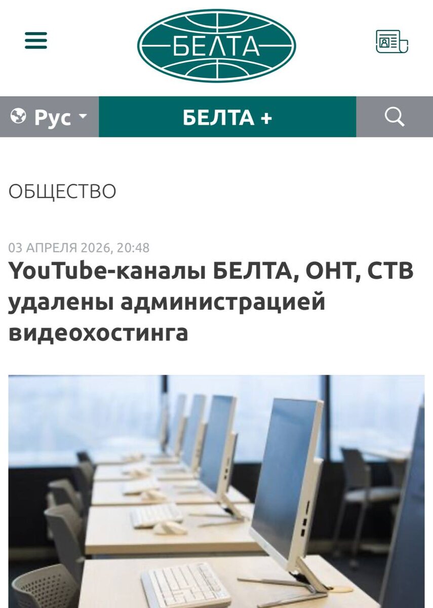 Видеохостинг YouTube удалил каналы белорусских медиаресурсов БЕЛТА, ОНТ и СТВ. Это может ограничить доступность их контента в Беларуси. В качестве причины удаления указаны санкции. В БЕЛТА заявили, что агентство не подпадает под санкционные ограничения. https://dzen.ru/id/5c0e38ff46ef5c00aaa80527