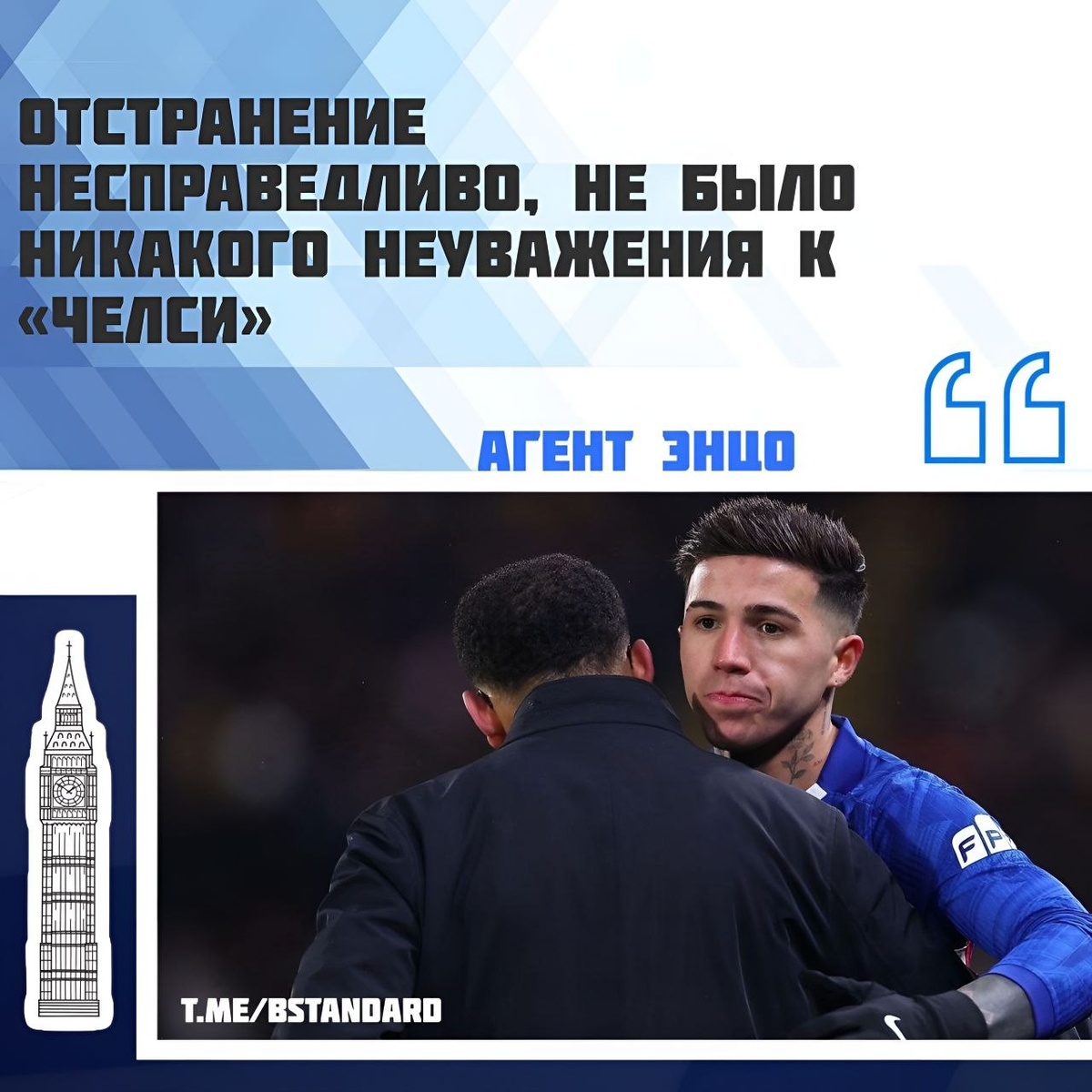 ⚽️⚽️⚽️⚽️⚽️⚽️⚽️⚽️⚽️ «Энцо эта ситуация непонятна. Когда тренер ему об этом сказал, он принял это, потому что он настоящий профессионал, который всегда отдает все силы в каждой команде и уважает решения тренера. Но наказание нам непонятно, потому что он не назвал ни одного клуба, не сказал, что хочет уйти из «Челси» – до этого далеко. Он только упомянул Мадрид, город, поскольку его спросили, в каком европейском городе он хотел бы жить в будущем. И он выбрал Мадрид из-за языка, из-за схожести с Буэнос-Айресом и потому, что это логично, это естественный ответ для аргентинца. А также из-за культуры, погоды... Но ни разу он не сказал, что хочет уехать из «Челси» или Лондона. Я видел его интервью, ни разу он не проявил неуважение к клубу, партнерам, фанатам, кому-либо еще. Наказание совершенно несправедливое. Отстранить футболиста на два матча, тем более критически важных для «Челси», поскольку на кону путевка в Лигу чемпионов... При этом Энцо – один из самых важных игроков команды. Конеч