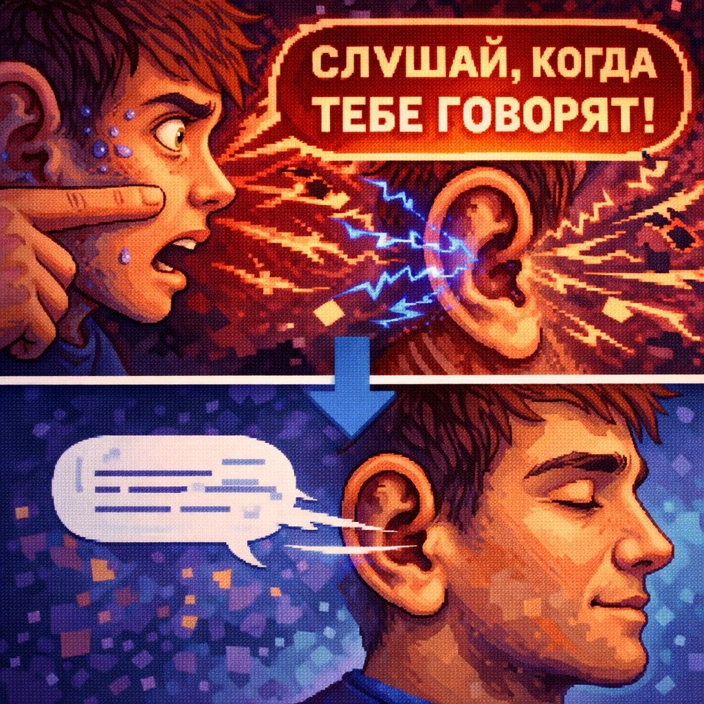 !» Фраза, которую многие слышали в детстве. И вот, допустим, эта штука запечаталась. Не просто как воспоминание, а как команда — слушай, воспринимай, иначе будет плохо. И после неё добавка, типа «а то сейчас получишь». То есть не просто слушай, а слушай с максимальной серьёзностью, потому что на кону что-то страшное 🥶 И что произошло в теле — создалась гипервосприимчивость к словам. Слуховой канал как будто расширился больше чем надо, стал пропускать слишком много. Каждое слово другого человека заходило слишком глубоко, слишком близко к сердцу, слишком серьёзно. То самое «принимает всё близко к сердцу» — вот оно откуда 🧠 И это создавало у человека постоянное перенапряжение. В общении с людьми — стресс, потому что каждая фраза воспринимается как что-то сверхважное. Каждое замечание — как удар. Каждый разговор на повышенных — как угроза жизни. Гипервовлечённость, от которой человек после обычного рабочего дня чувствует себя так, будто отработал смену на стахановской передовой 🔮 Ког