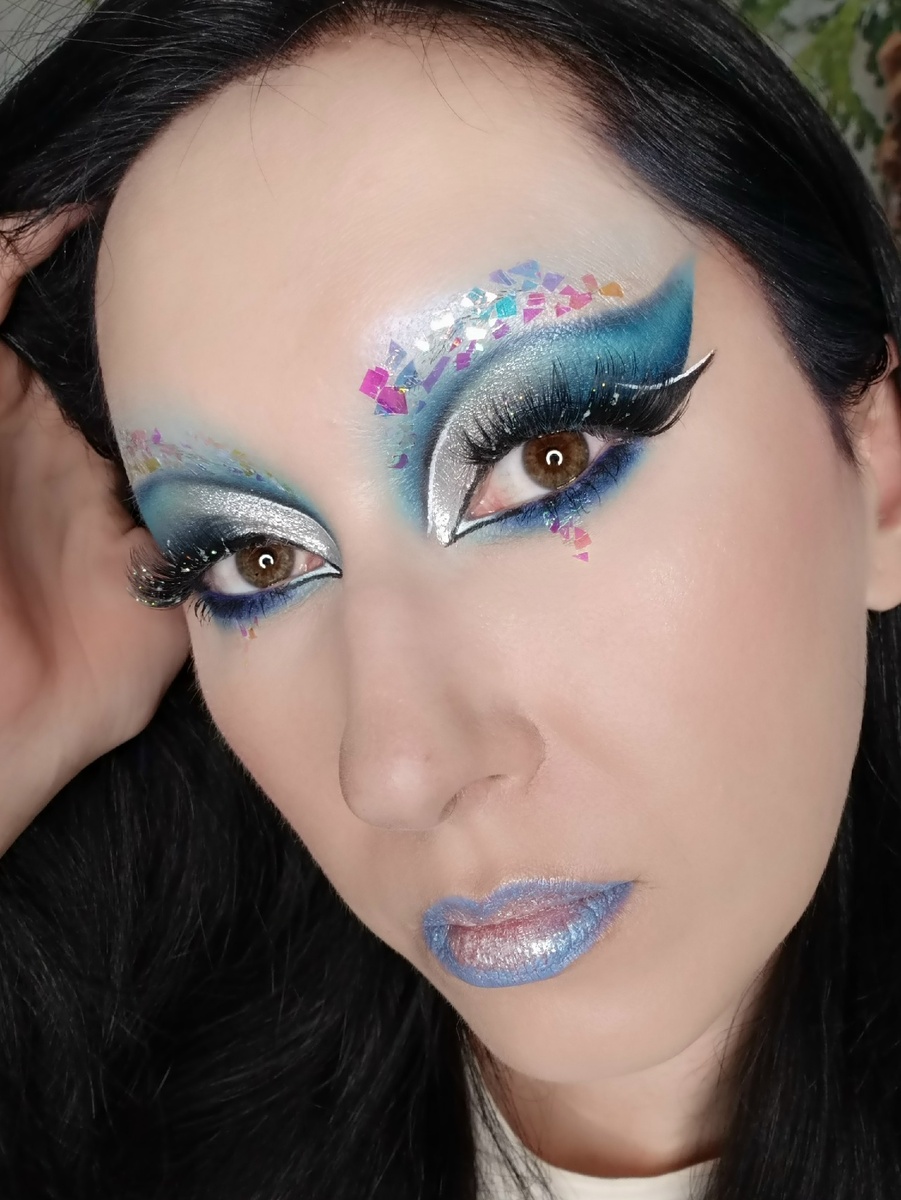 Я люблю рассматривать фотографии макияжей. А ещё я люблю думать, что же вдохновляло человека. Но теперь у меня новые мысли - а автора макияжа он точно устраивает? Потому что у меня иногда макияжи получаются не такими, какими я их задумывала. Сегодня именно о таком случае я и хочу поговорить. Это был мой самый первый макияж в этом году. Хотелось этаких хлопьев снега, которые переливаются под светом фонарей. Но со "снегом" что-то пошло не так. Возможно конечно блестяшки надо было более толстым слоем нанести, но вряд ли бы что-то кардинально изменилось. В общем, заказала я на ВБ такие вот хлопья для маникюра. Все разной формы, переливаются безумно красиво разными цветами. Проблема как раз в этом разноцветном переливе и оказалась, а ещё в том, что хлопья прозрачные. Честно говоря, я вообще не ожидала, что на лице они будут настолько разноцветными. На видео мерцают красиво, а на фото получилось... Что получилось 🤷♀️ На фото эти хлопья получаются или белыми зеркалами, или цветными стекляшк