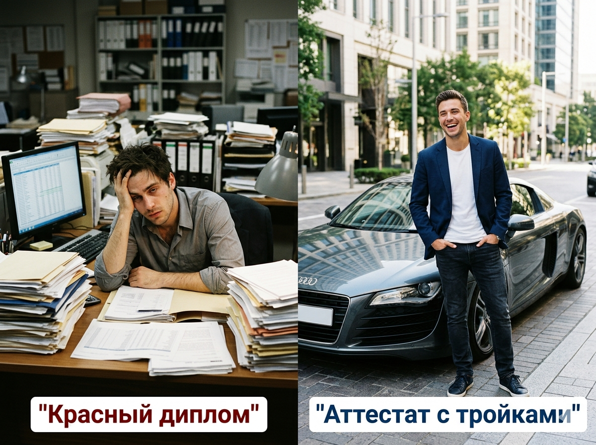 Посмотрите на встречу выпускников спустя 10 лет. Вот он, наш золотой медалист Сережа: выглядит так, будто последние пять лет его пытали Excel-таблицами и запахом дешевого офисного кофе. А вот Димон, который путал Австрию с Австралией и считал, что гипотенуза — это вид динозавра. Димон приехал на машине, стоимость которой равна бюджету небольшого африканского государства. Почему система образования штампует идеальных рабов, но ломается на тех, кто хочет чего-то большего? Давайте снимем розовые очки и разберем эту несправедливость по косточкам.